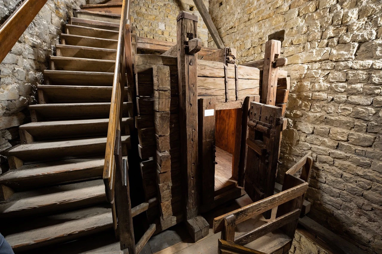 Die massiven Blöcke des Fundaments des mittelalterlichen Turms, der an die ehemaligen Gefängnisse angrenzt, stammen aus der Römerzeit. Diese Steine wurden um das Jahr 1000 von der benachbarten Burg Colombier, ursprünglich eine gallo-römische Villa, entnommen.